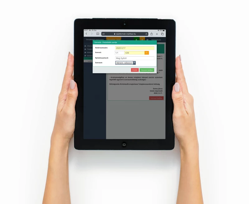 Hibrid szavazási lehetőség, azaz, a szavazatokat le lehet adni írásban a közös képviselőnek, az interneten egy okostelefonról, vagy akár kézfeltartással a közgyűlésen.